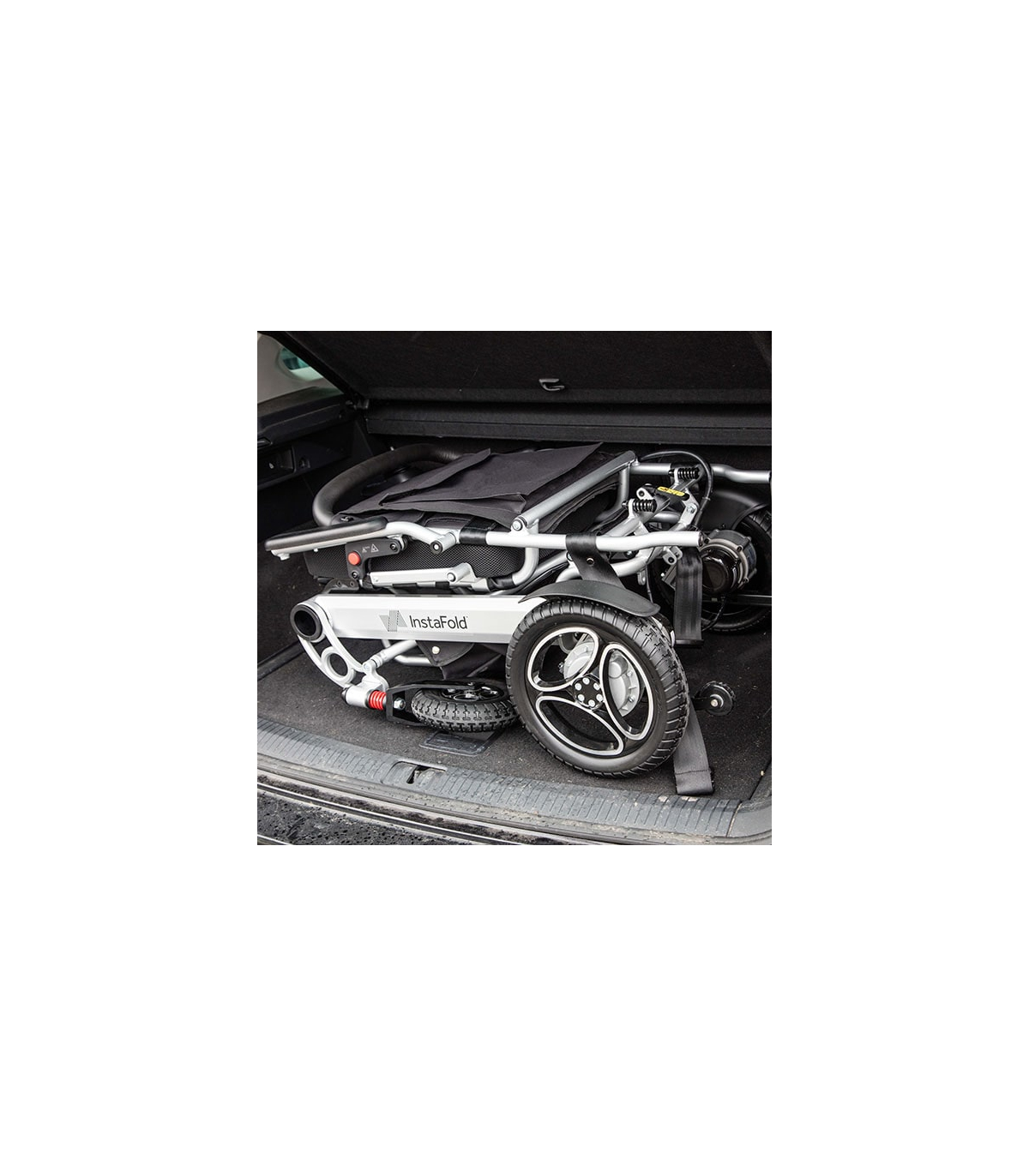 De plus, le fauteuil roulant électrique Instafold est livré de série avec un sac sous le siège pour un rangement facile d'accès de vos objets de valeur.