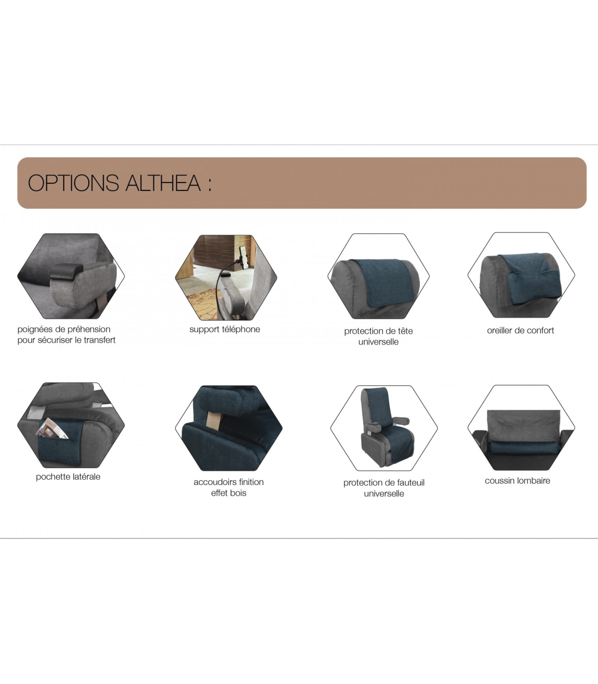 Disponible en plusieurs coloris raffinés, le fauteuil de confort médical Althea s’intègre harmonieusement à votre intérieur. Trois finitions sont proposées :