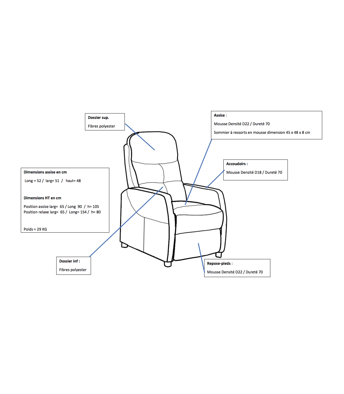 ATTENTION: Avant toute commande, il est important de bien prendre les mesures (largeur d'assise / profondeur d'assise / hauteur d'assise) afin de définir la taille de votre fauteuil de repos.