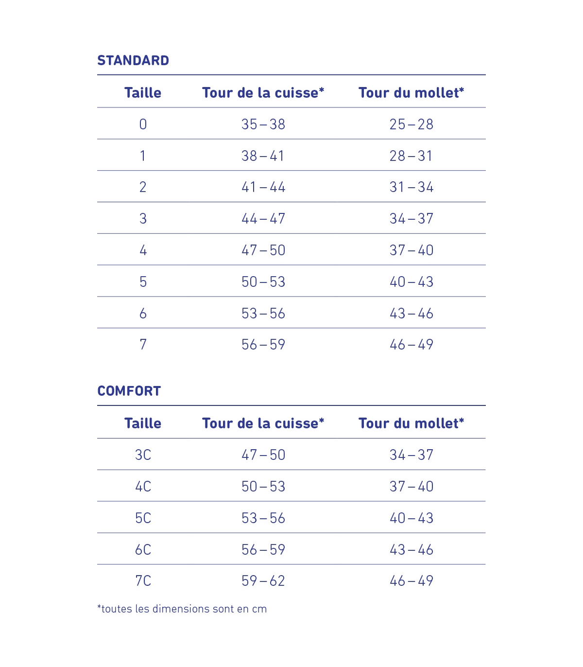 | Tailles | Tour de la cuisse | Tour du mollet |
