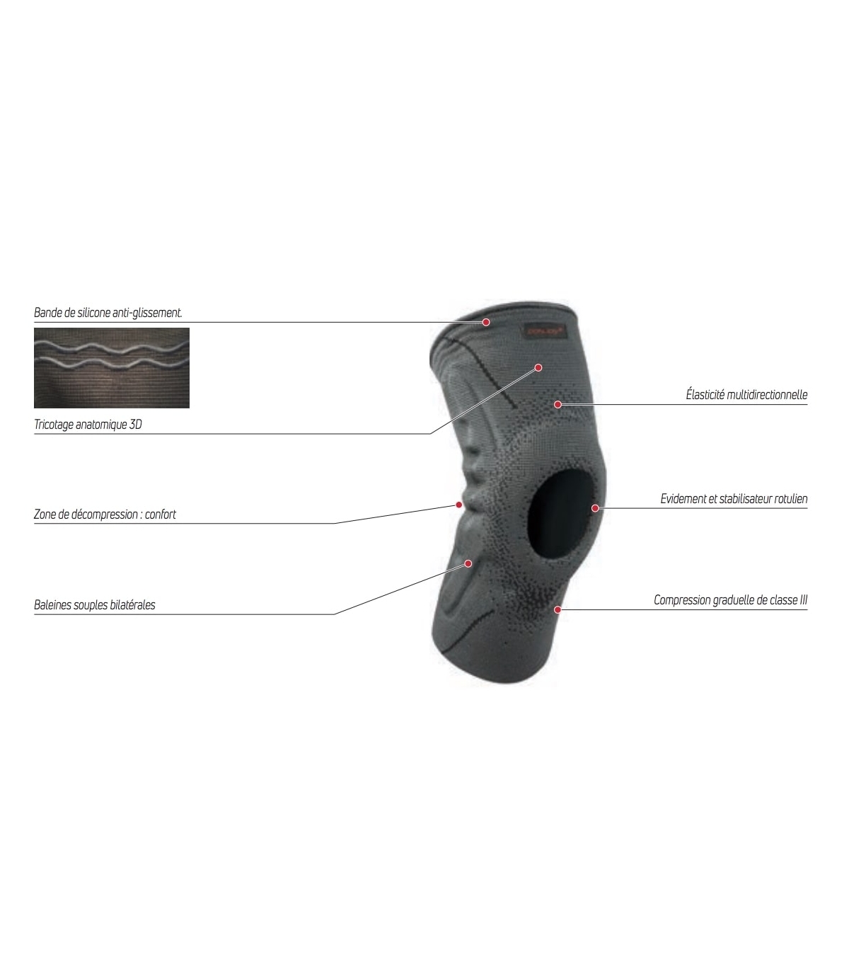 L'attelle Rotulax de Donjoy procure une forte compression (20 à 36 mmHg) du membre ou du segment corporel grâce à une construction élastique.