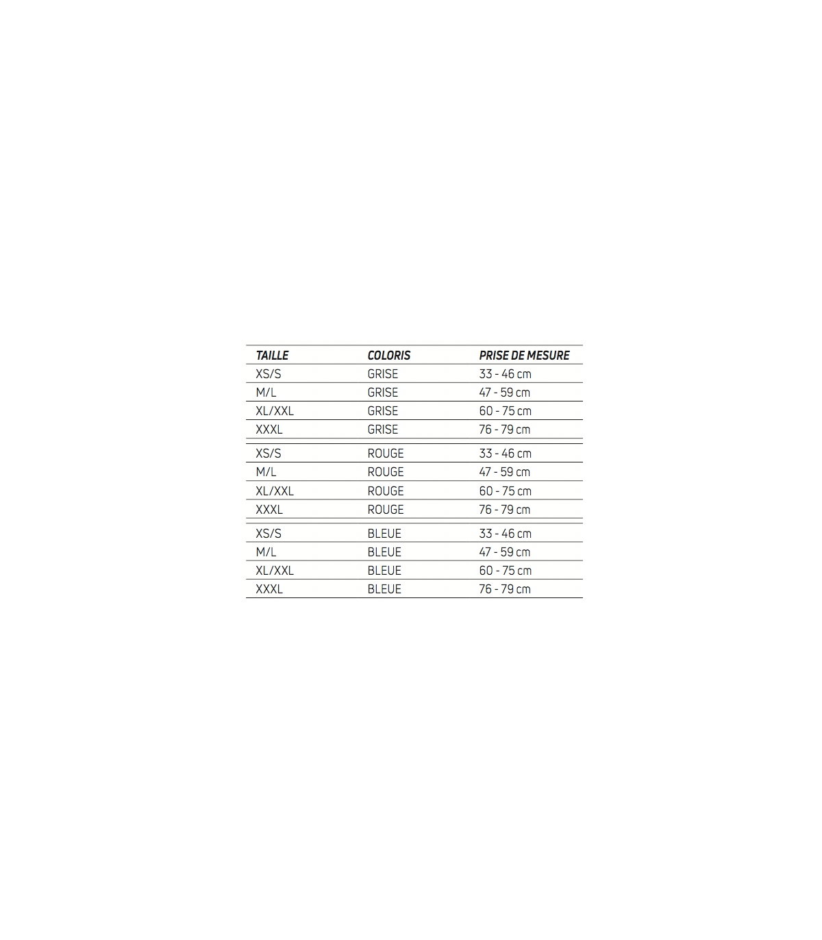 | Taille XXXL | 76 - 79 cm |