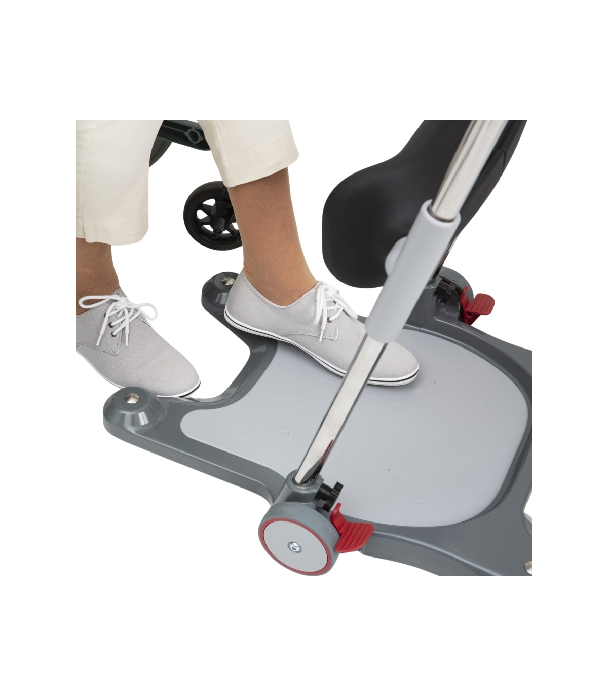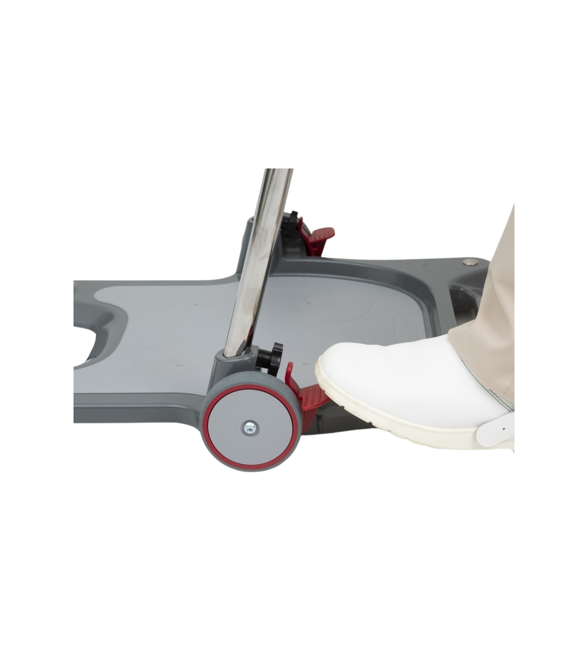 En outre, les roues sont équipées d’un frein à cliquet qui émet un signal sonore lorsque le verrouillage est activé, informant ainsi le soignant que la plateforme est sécurisée.