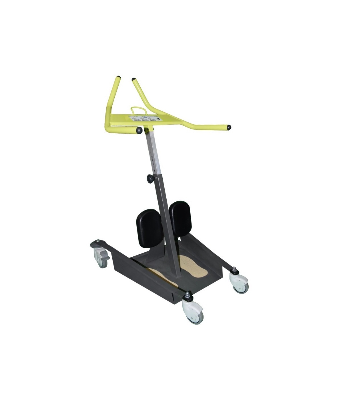 Il comporte une base déplaçante ainsi que des appuis tibiaux inclinables pour accompagner le transfert "assis-debout-assis".