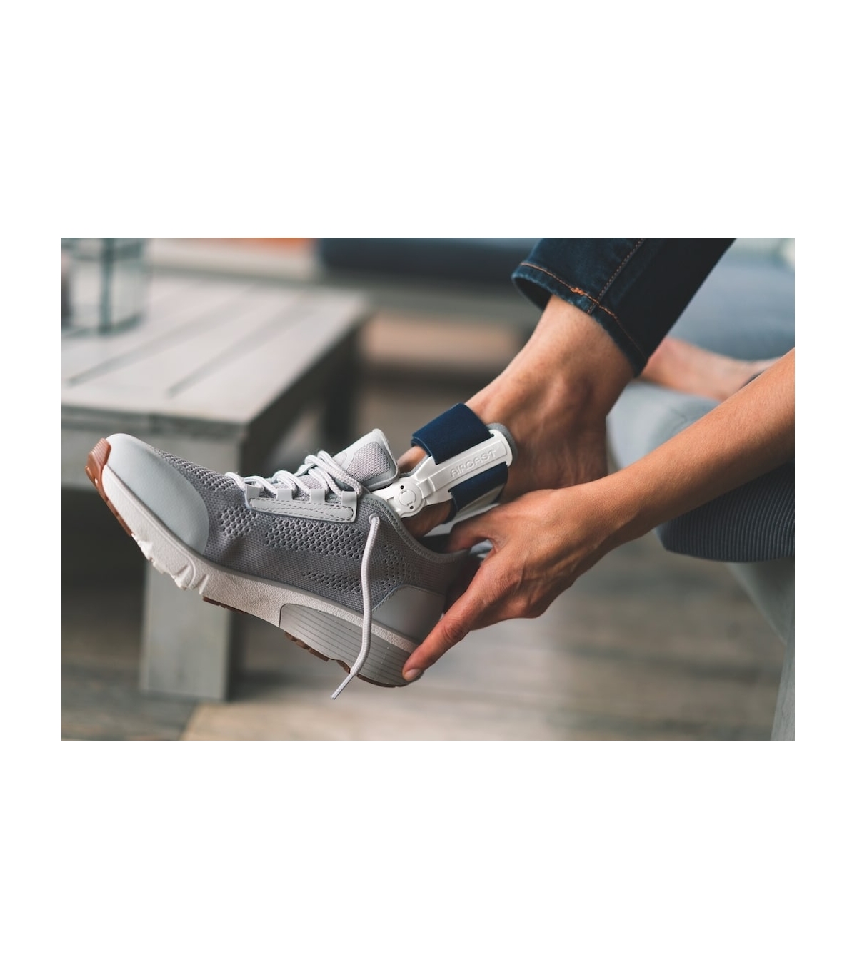 L'orthèse bilatérale articulée Actytoe disponible dans nos accessoires orthopédiques peut être portée avec des chaussures larges pour une marche sans douleur.