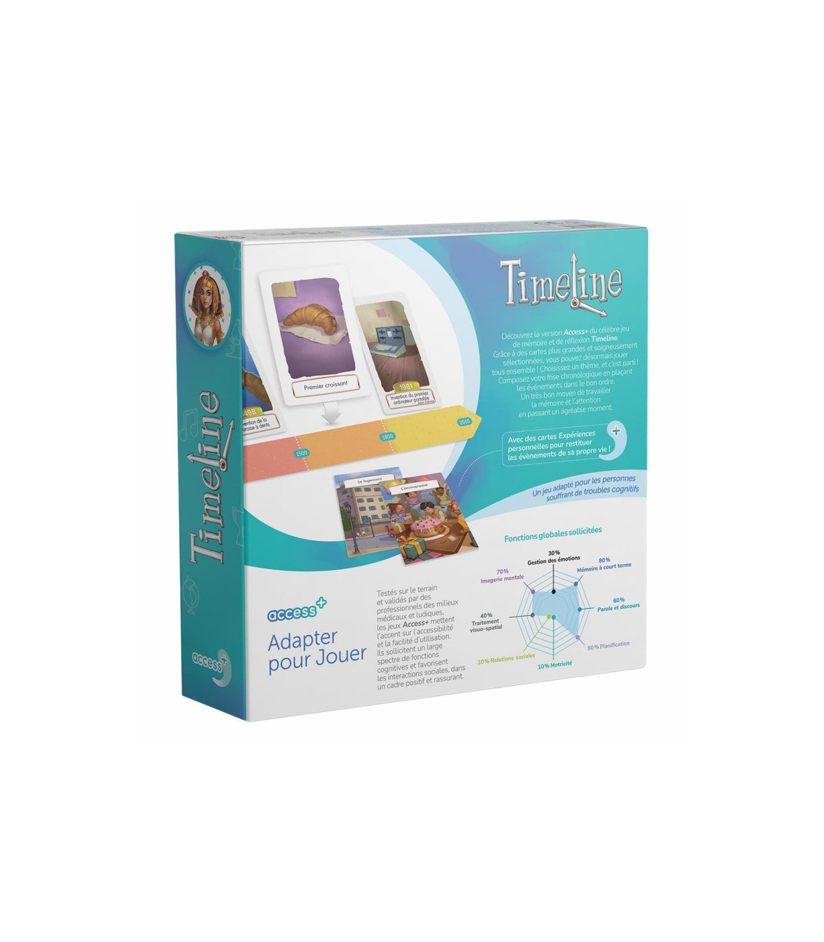 Le jeu de cartes Timeline Access + est particulièrement adapté aux personnes présentant des troubles cognitifs ou de la mémoire comme la maladie de l'Alzheimer. Que vous soyez un professionnel de la santé, un aidant, ou que vous cherchiez un jeu à partager en famille, Timeline Access + encourage la réflexion et la mémoire tout en restant convivial.