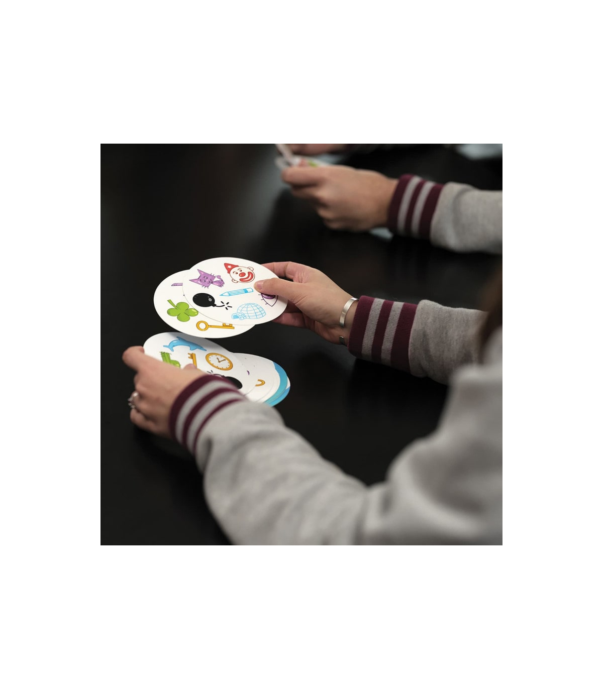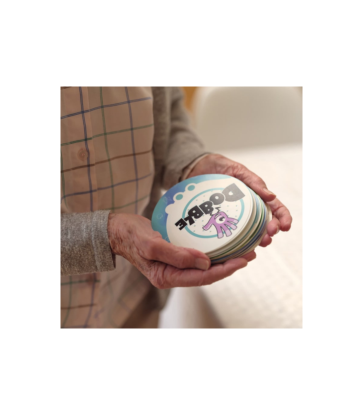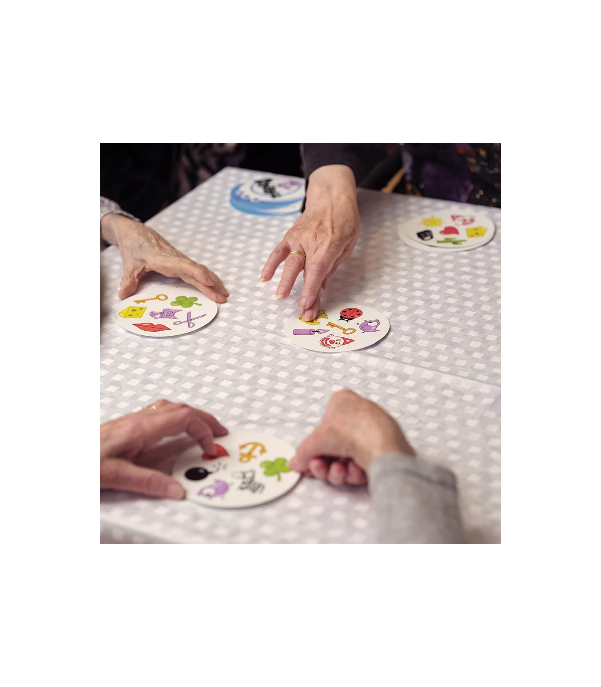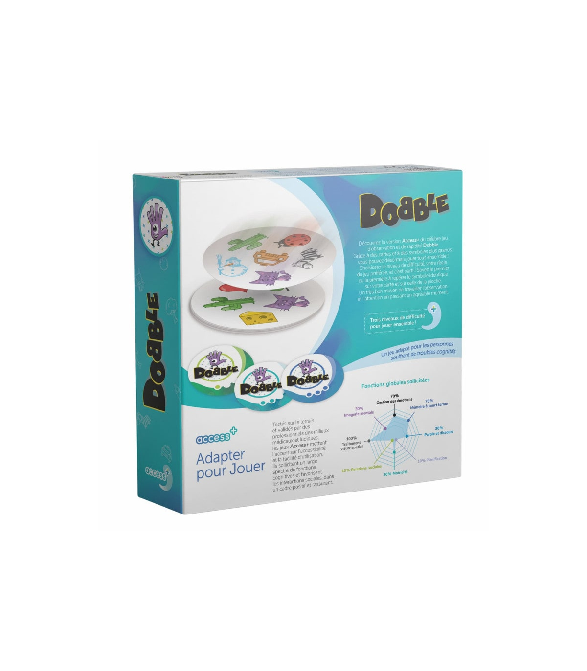 Dobble Access+ est conçu pour toute personne en quête d'un jeu convivial et accessible, quel que soit l’âge. Enfants, adultes, seniors: Chacun pourra profiter des bienfaits de ce jeu d'observation grâce aux cartes optimisées et aux niveaux de difficulté ajustables, facilitant ainsi l’inclusion et la jouabilité pour tous. En outre, il est particulièrement adapté aux personnes qui souffrent de troubles cognitifs.