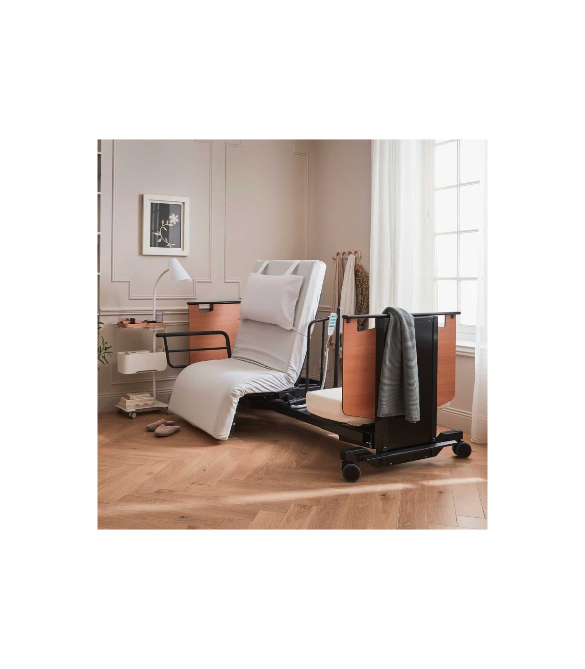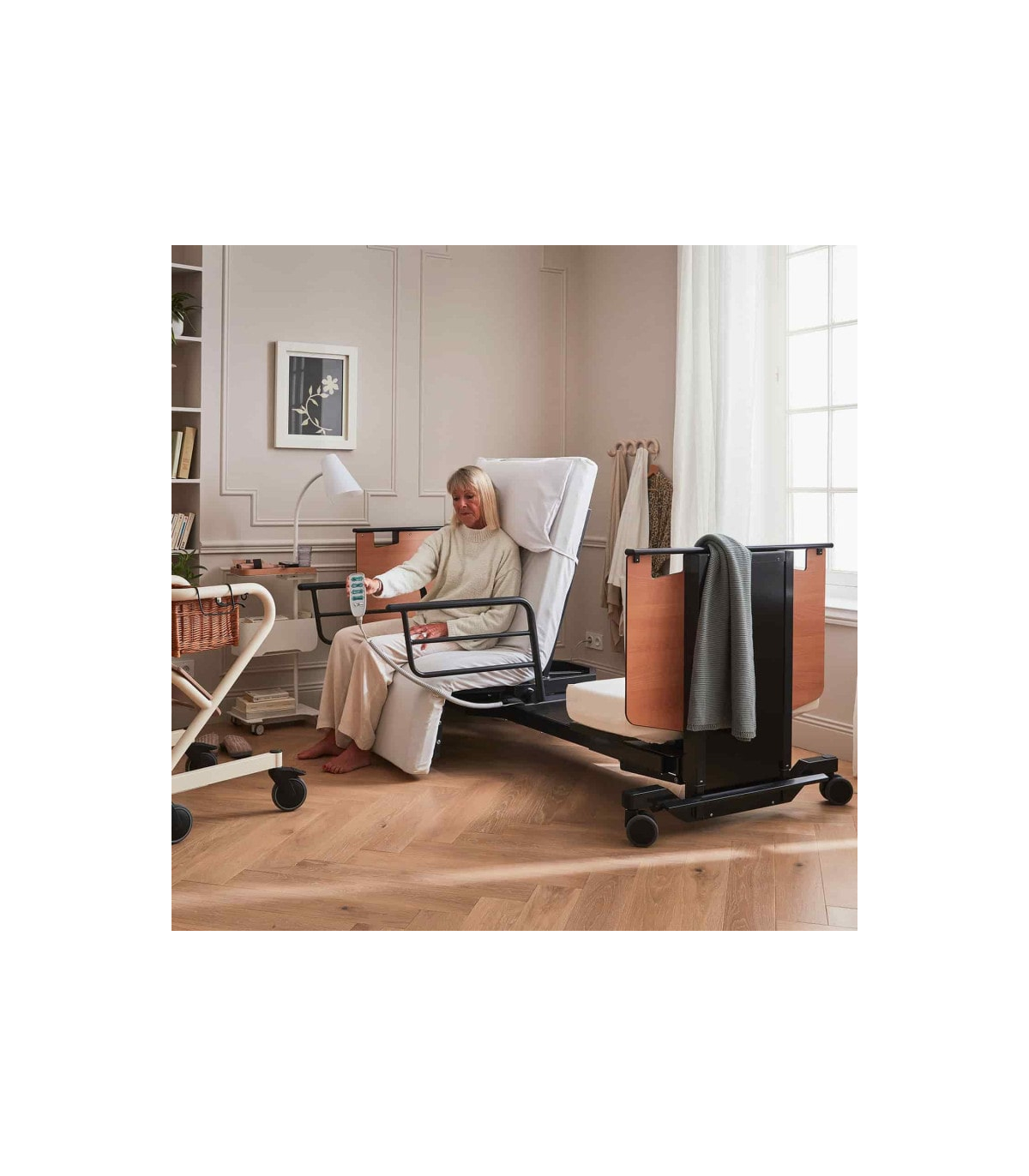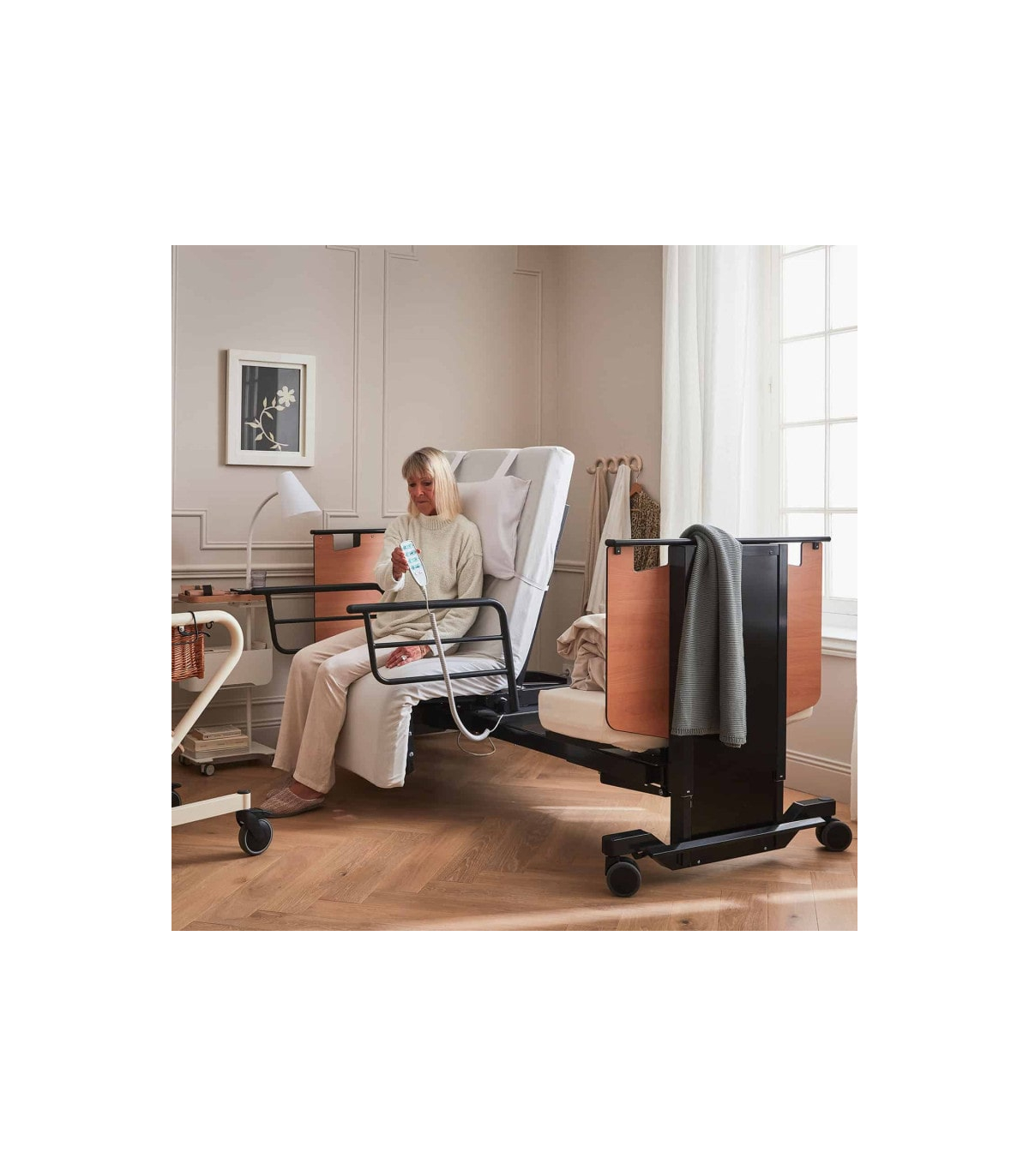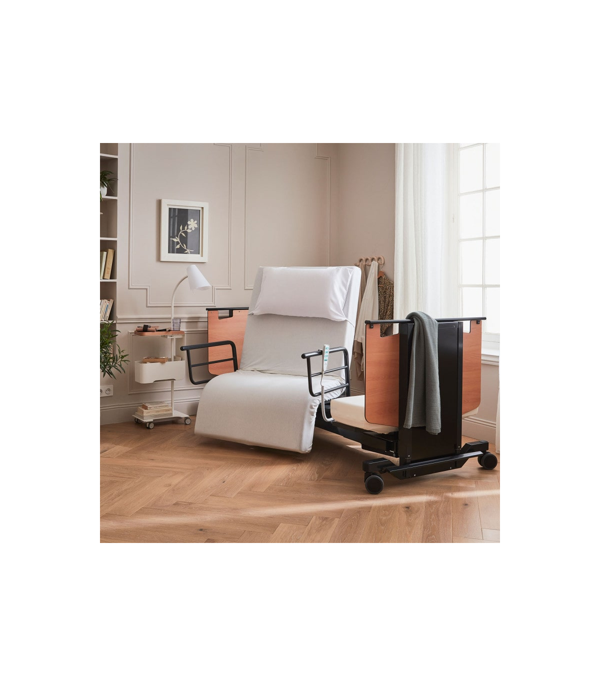 En complément de la rotation, le lit Orbit proposé à un prix attractif dispose d’une fonction de levage progressif de l’assise, idéale pour atteindre une position semi-debout. Ce mouvement accompagne naturellement le corps, offrant un appui stable pour rejoindre un fauteuil roulant ou une chaise sans effort ni douleur. Cette fonction favorise l’autonomie et renforce la sécurité des déplacements au quotidien.