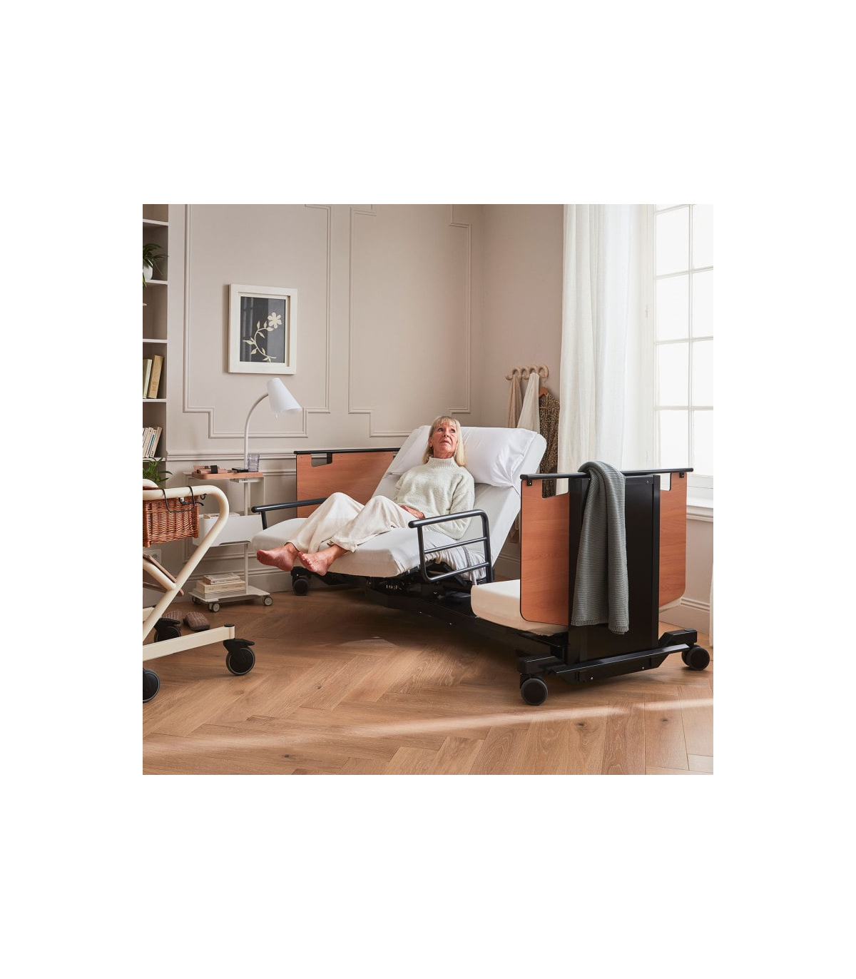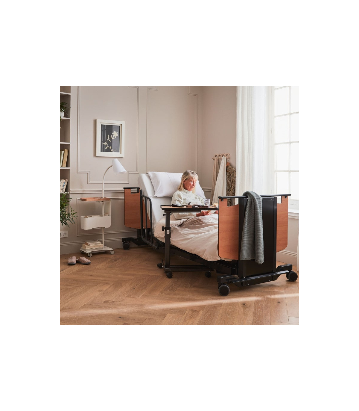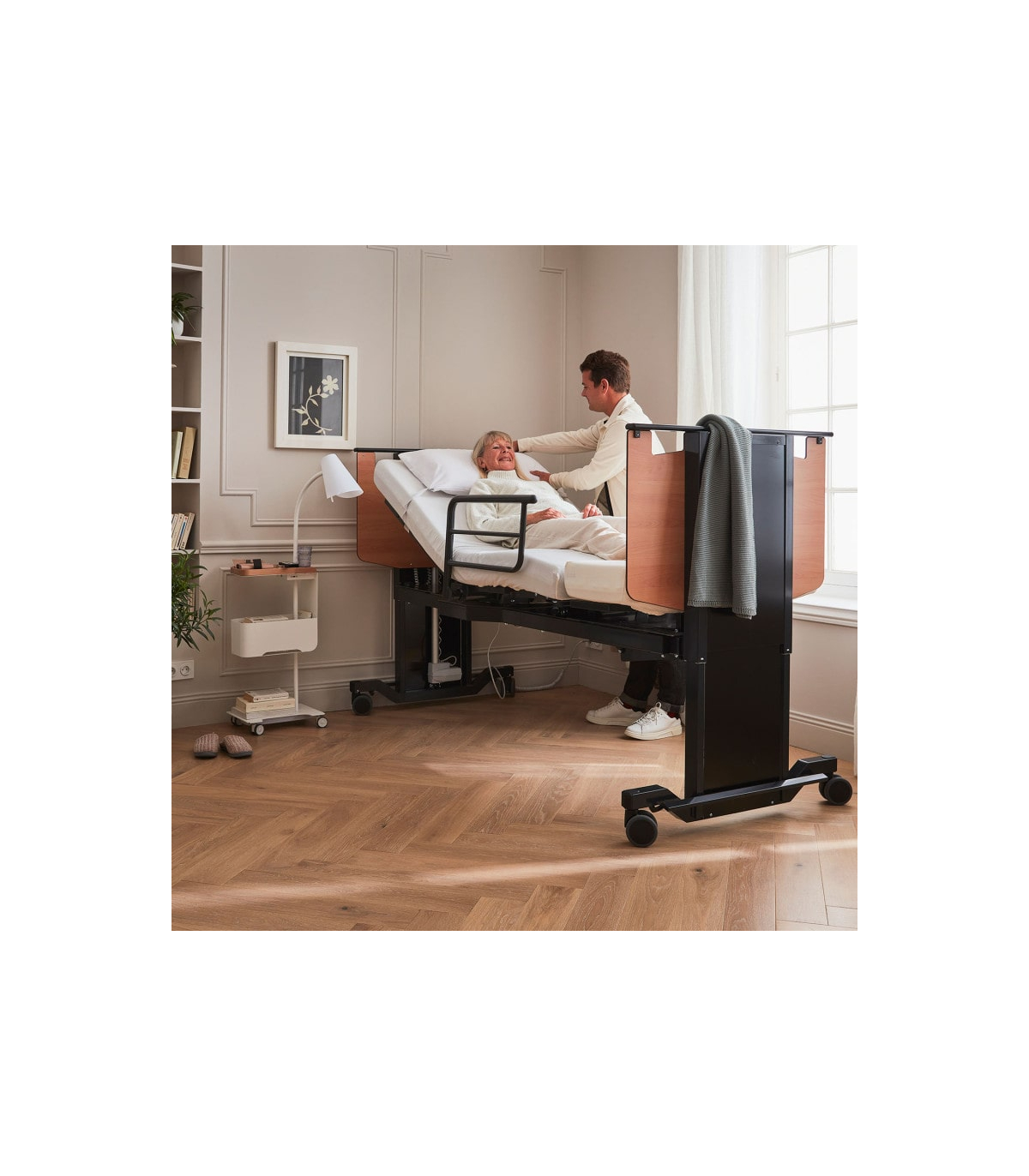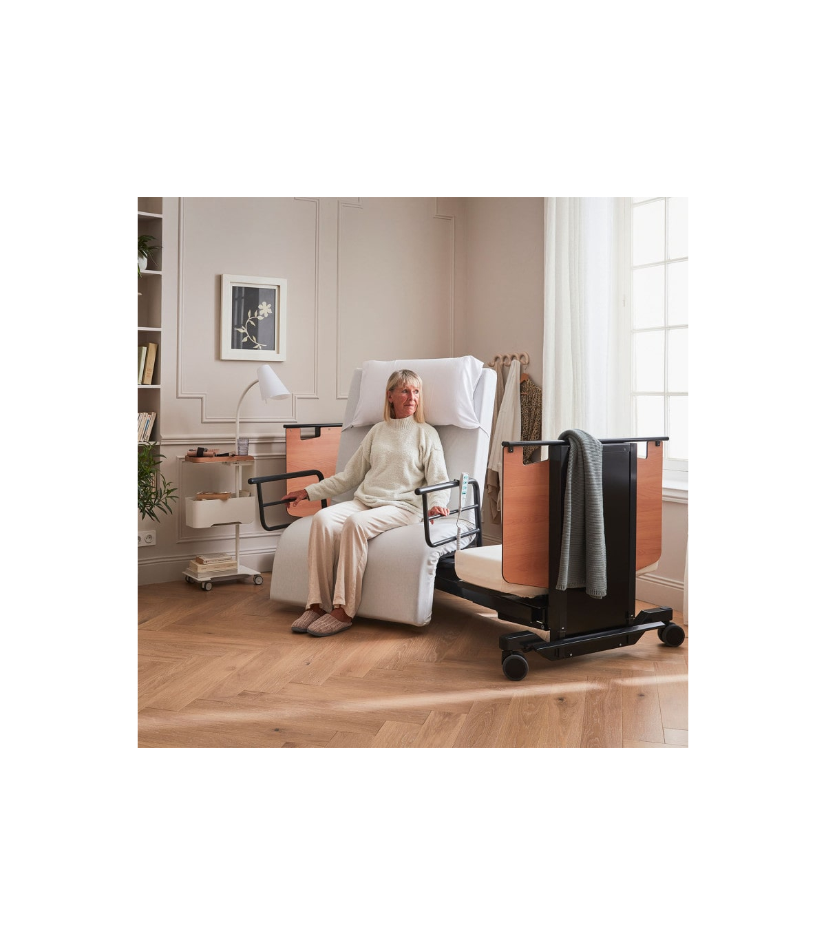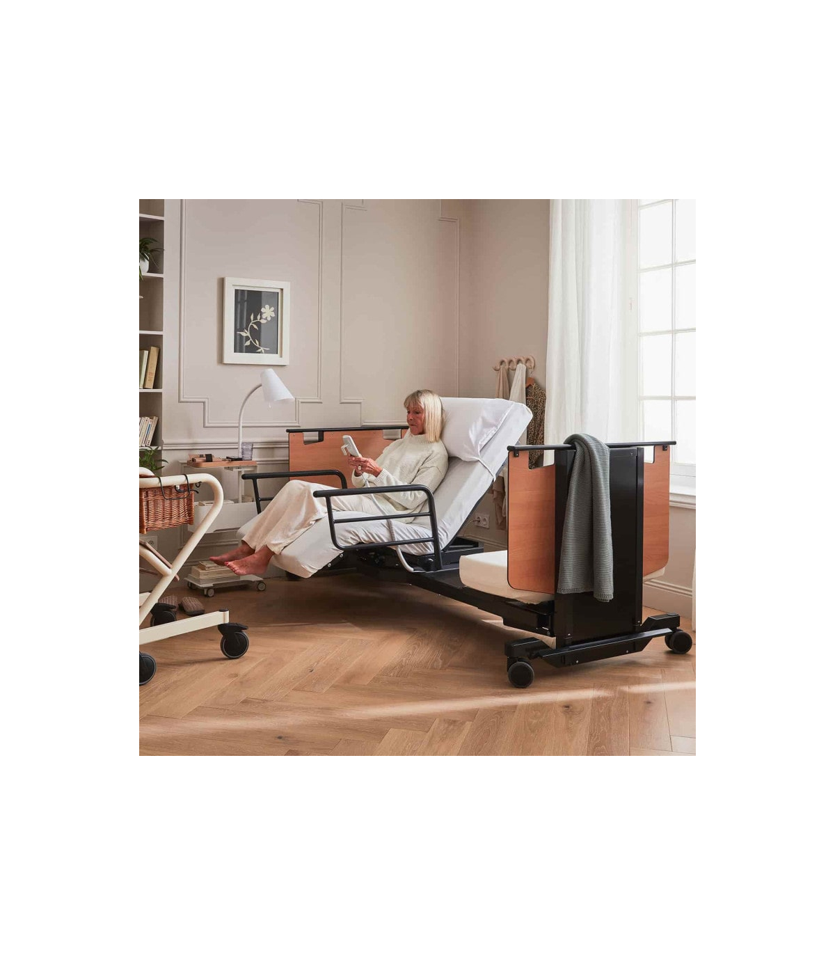 En complément de la rotation, le lit Orbit proposé à un prix attractif dispose d’une fonction de levage progressif de l’assise, idéale pour atteindre une position semi-debout. Ce mouvement accompagne naturellement le corps, offrant un appui stable pour rejoindre un fauteuil roulant ou une chaise sans effort ni douleur. Cette fonction favorise l’autonomie et renforce la sécurité des déplacements au quotidien.