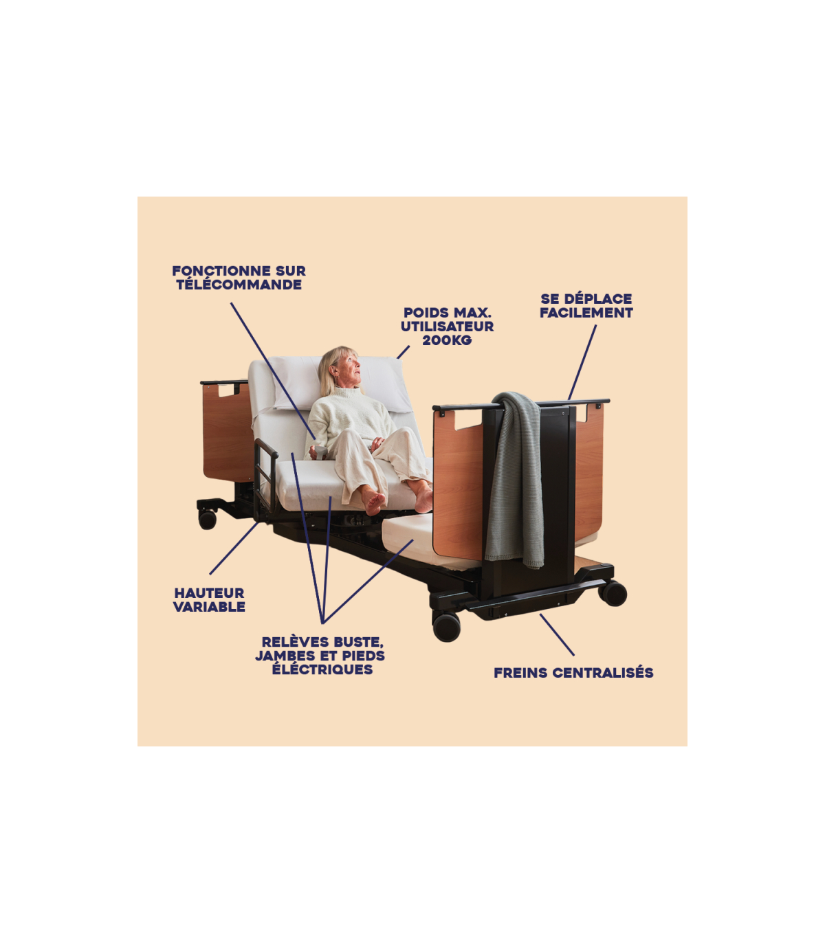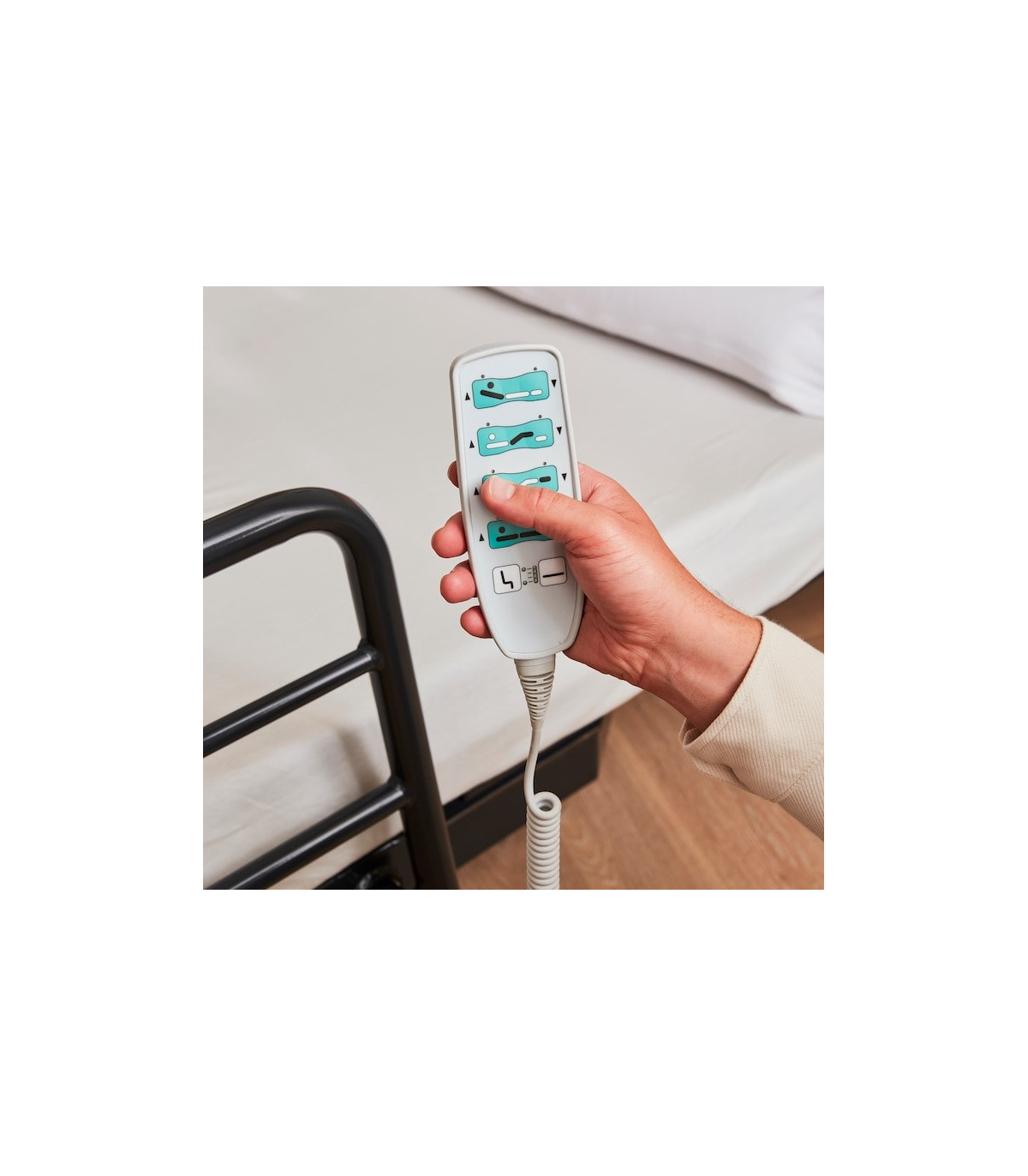 Chaque zone du lit médicalisé peut être ajustée individuellement grâce à un système électrique complet contrôlable avec la télécommande fournie. Le dossier, les jambes et les pieds se règlent de manière indépendante pour s’adapter aux besoins médicaux ou aux moments de la journée : Repos, lecture, repas au lit ou circulation sanguine améliorée. De plus, la hauteur du sommier, réglable de 28 à 80 cm, facilite les soins pour l’aidant et permet à l’utilisateur de monter ou descendre du lit plus facilement.