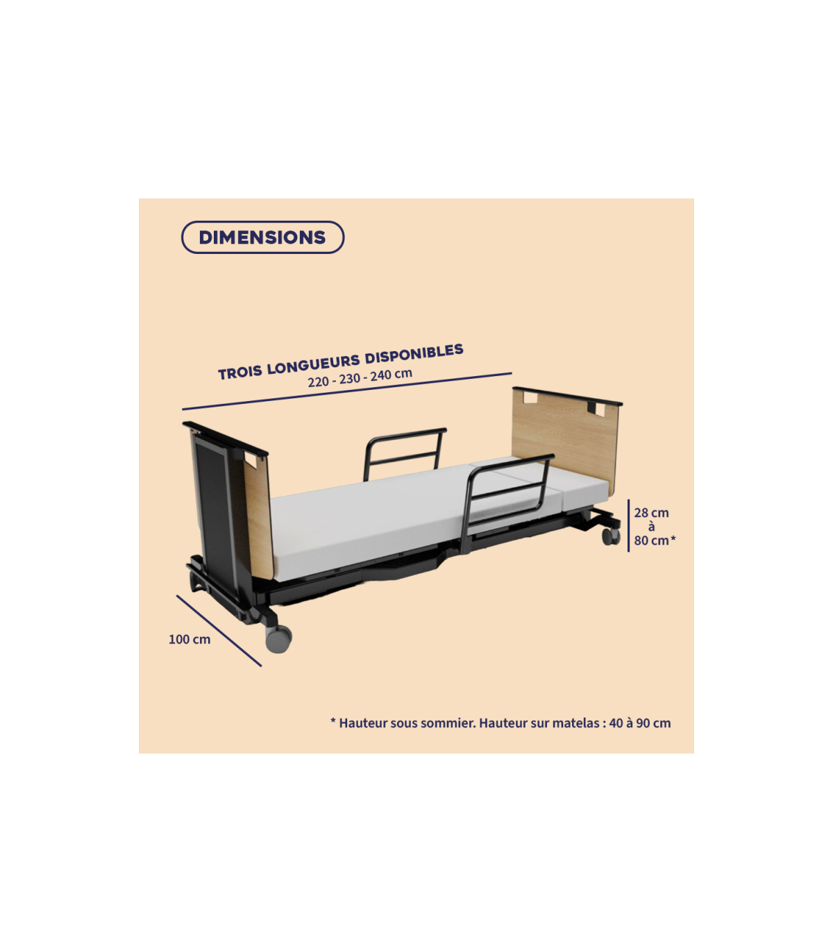 Le lit médicalisé Orbit est disponible en trois longueurs de couchage pour convenir à toutes les tailles d’utilisateurs, y compris les personnes de grande stature. Le sommier réglable de ce matériel médical est ajusté à l’installation selon l’option choisie :