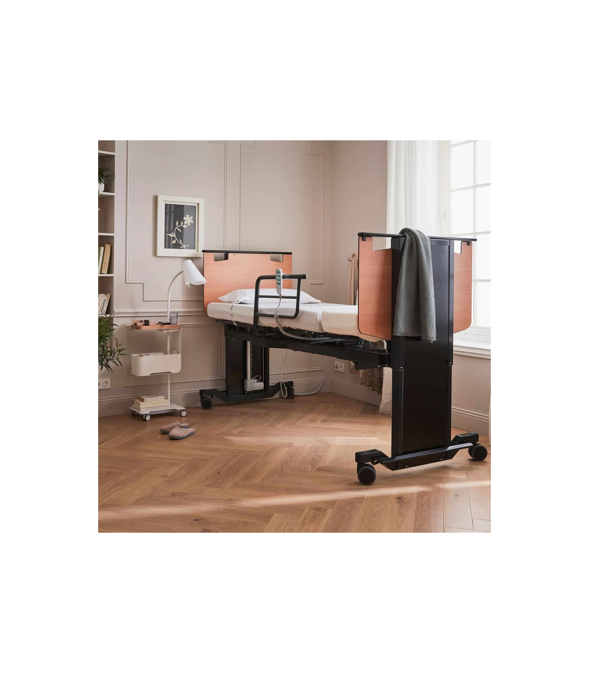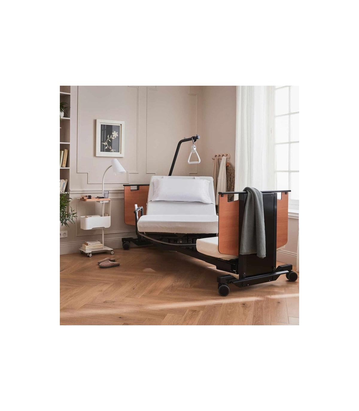 Le lit médicalisé 1 personne électrique Orbit est équipé d’un sommier rotatif capable de pivoter jusqu’à 60°, à gauche ou à droite, selon la configuration choisie à l’installation. Cette fonction permet à l’utilisateur de passer aisément de la position allongée à la position assise, en toute sécurité. La rotation assistée rend les transferts beaucoup plus fluides et limite le besoin d’assistance extérieure.