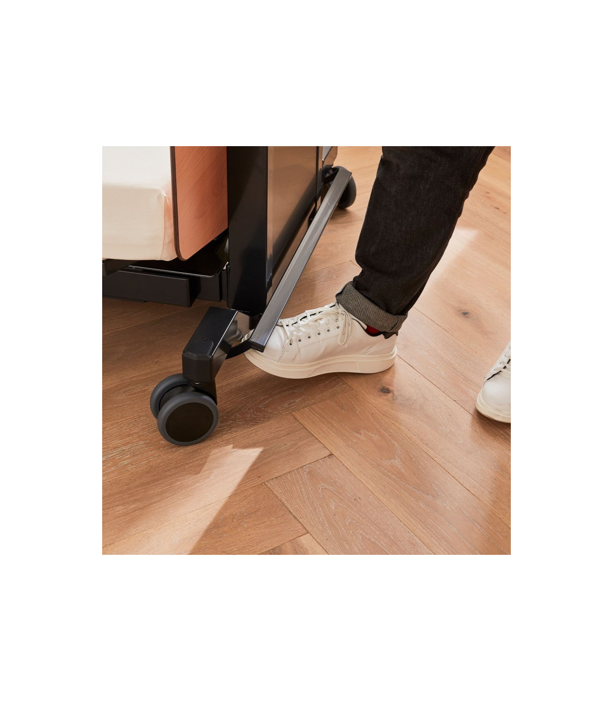 Le lit médicalisé Orbit est doté de quatre roulettes pivotantes, permettant de le déplacer facilement dans la pièce. Grâce à son système de frein centralisé, l’immobilisation du lit est simple et rapide : Une seule action suffit pour bloquer l’ensemble des roues. Cette configuration assure à la fois mobilité lors des soins et stabilité totale une fois le lit en place, pour un usage sécurisé au quotidien.