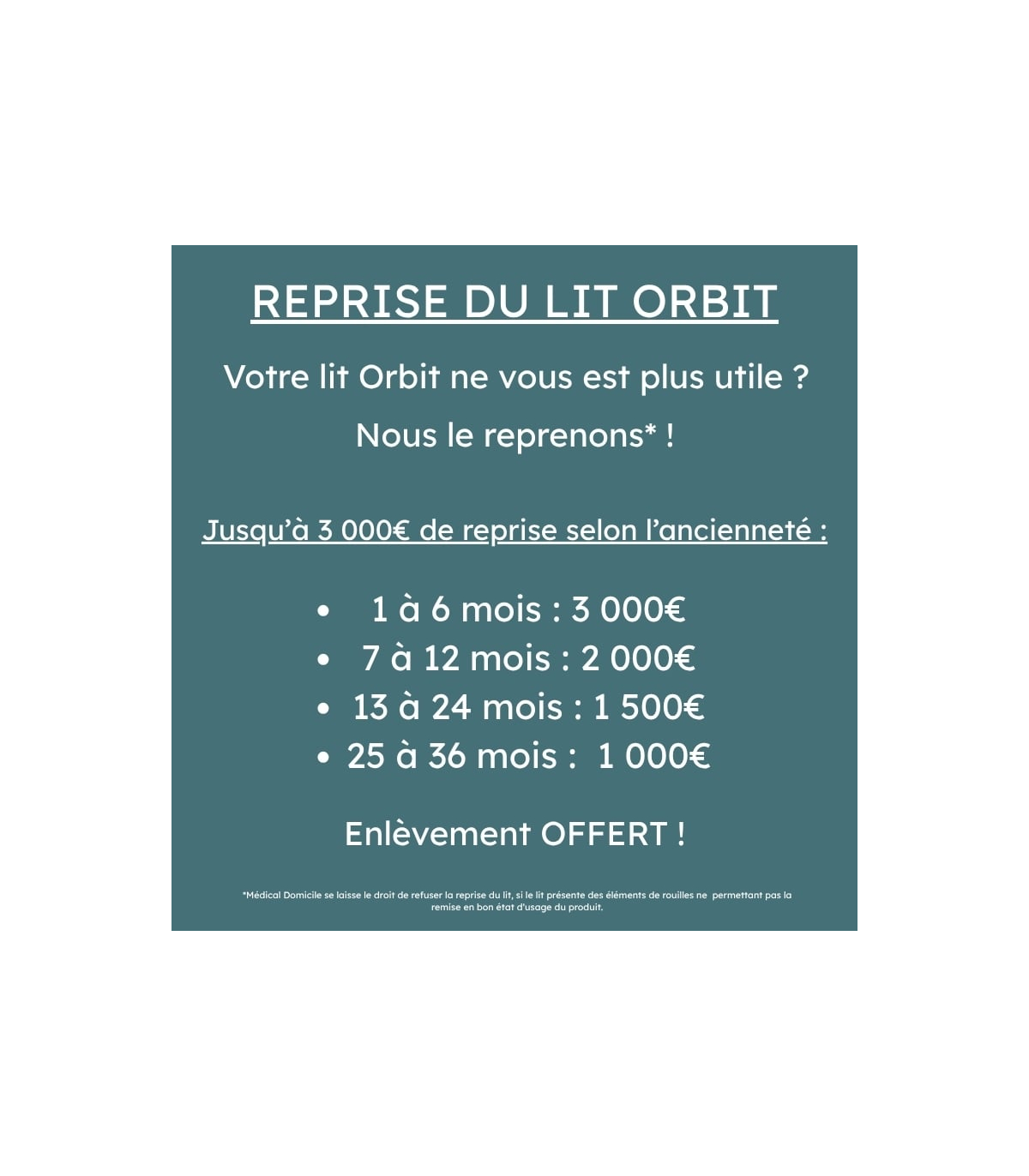 *Veuillez noter que Médical Domicile se réserve le droit de refuser la reprise si le lit présente un état incompatible avec une remise en condition, notamment en cas de corrosion importante.