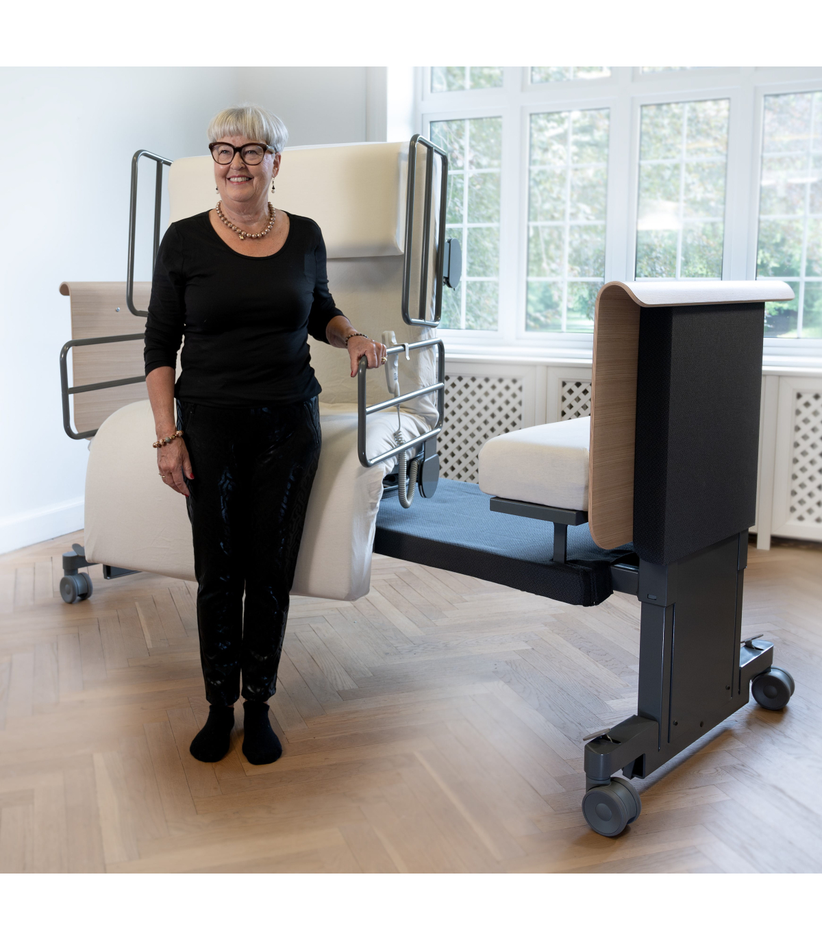 Le lit électrique Rotobed Free offre une rotation automatisée et un relevage motorisé, permettant de passer aisément de la position allongée à la position assise sans effort, grâce à une télécommande intuitive.