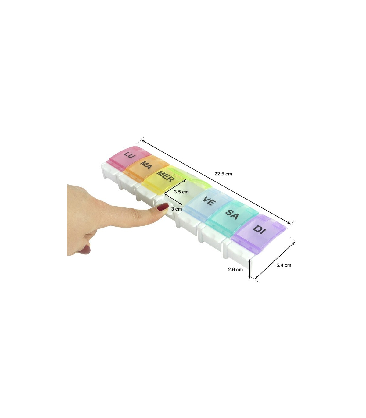 Grâce à sa taille compacte (22,5 cm × 5,4 cm × 2,6 cm), le pilulier pour médicaments est facile à poser et à transporter.
