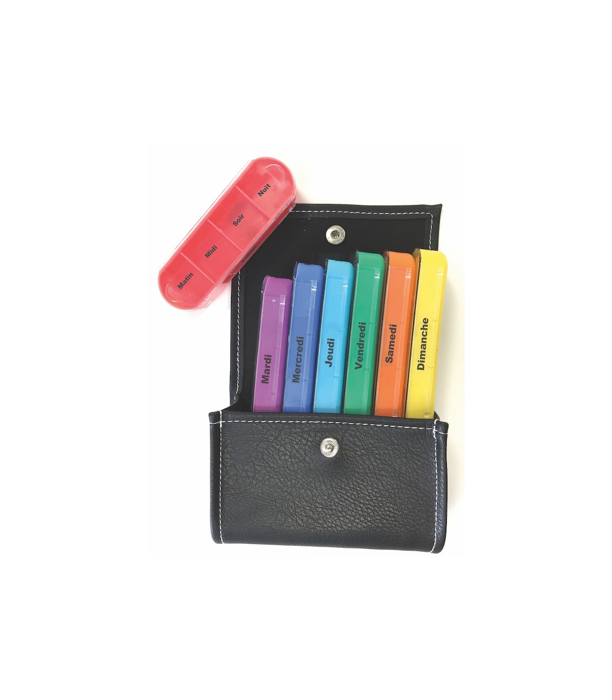 Le pilulier semainier avec pochette médicament Evolution comporte plusieurs compartiments permettant de ranger facilement des doses précises de médicaments. Ce produit de soins permet à l'utilisateur ayant une maladie de suivre son traitement jour par jour.