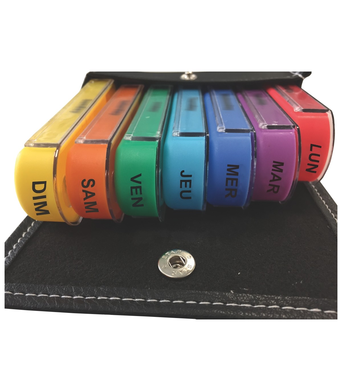 Pour emporter facilement votre pilulier avec vous, celui-ci est muni d'une trousse en cuir cousu sur-mesure. De plus, celle-ci se ferme facilement grâce à une pression.
