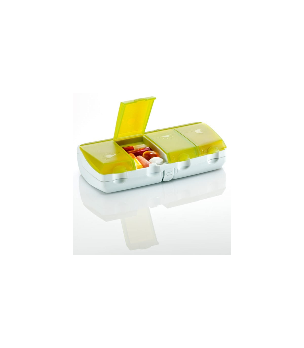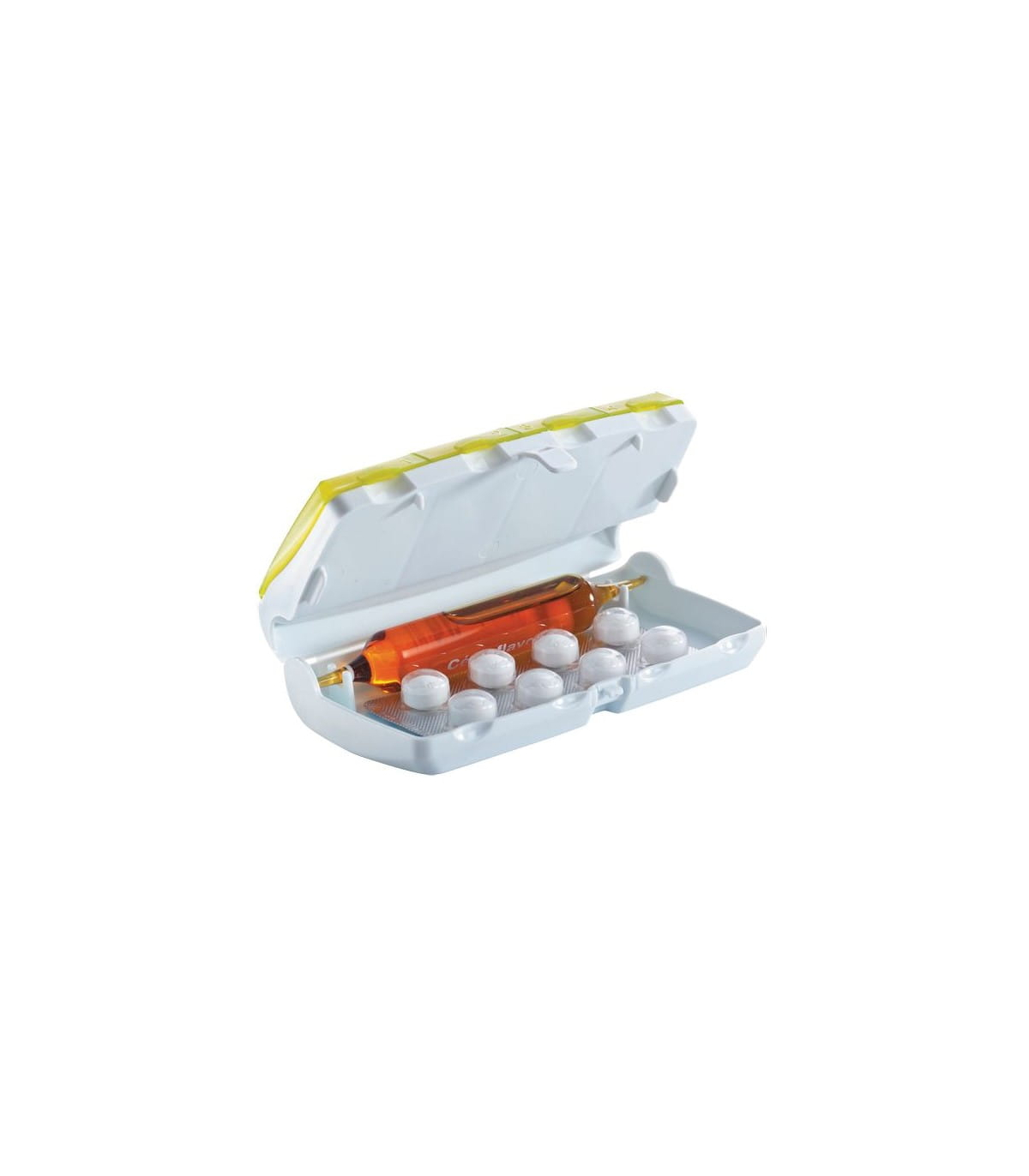 En outre, le pilulier possède également un compartiment inférieur de grande capacité, destiné au rangement d’autres formes de médicaments comme les ampoules, les sachets, les blisters ou les tubes d’homéopathie.