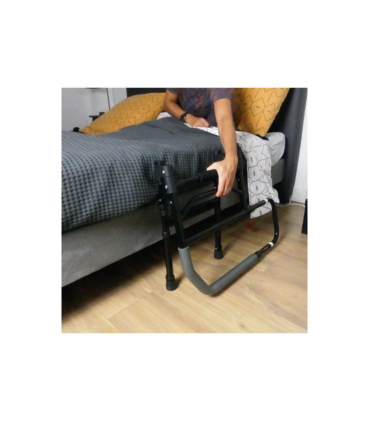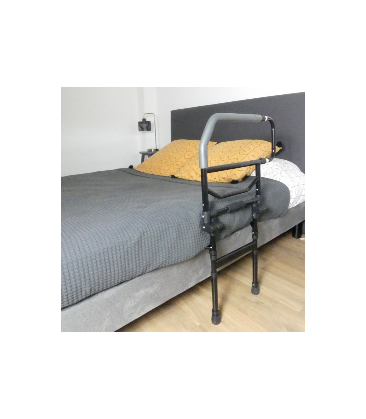 La barrière de lit rabattable comporte 2 pieds en contact avec le sol pour apporter davantage de sécurité à la personne alitée.