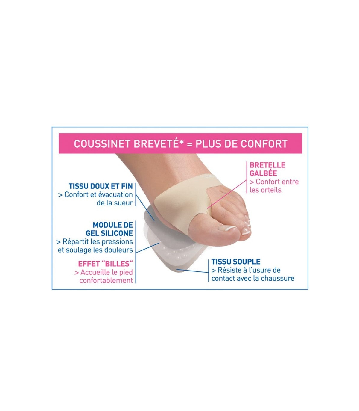 Conçue pour un ajustement parfait, la bretelle ergonomique de la paire de coussinets Comfortact Plus épouse les courbes naturelles du gros orteil. Cela permet de les maintenir en place, tout en limitant les irritations entre les orteils. La souplesse du tissu assure un maintien optimal tout au long de la journée.