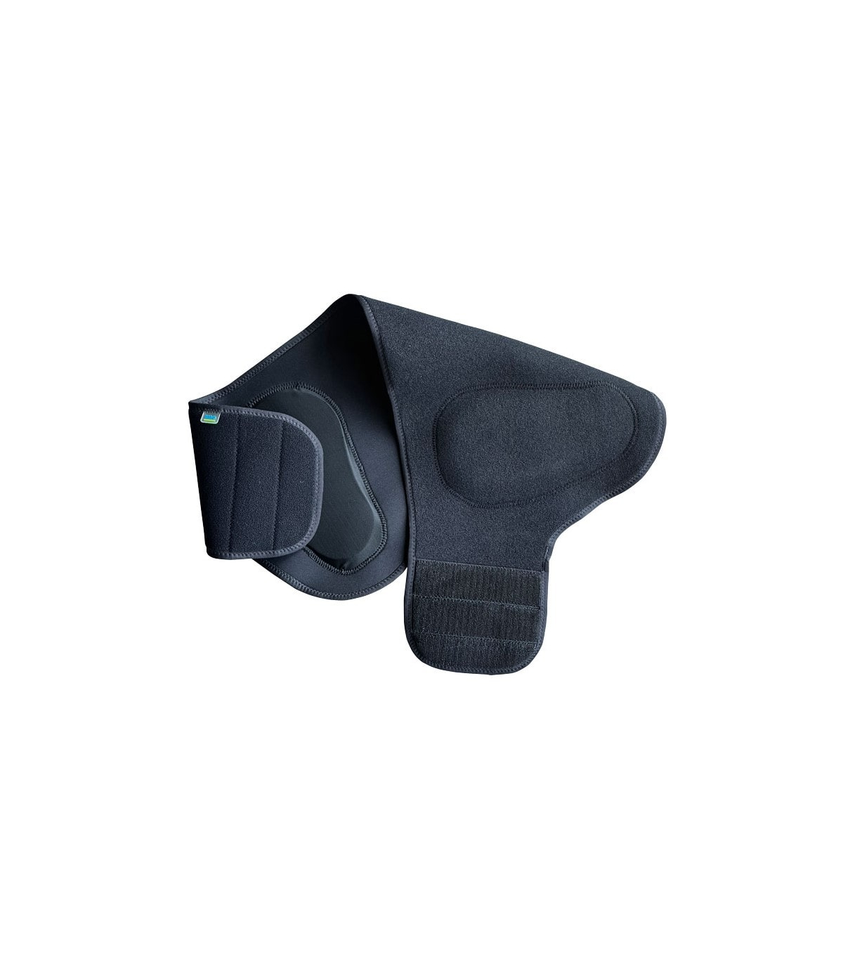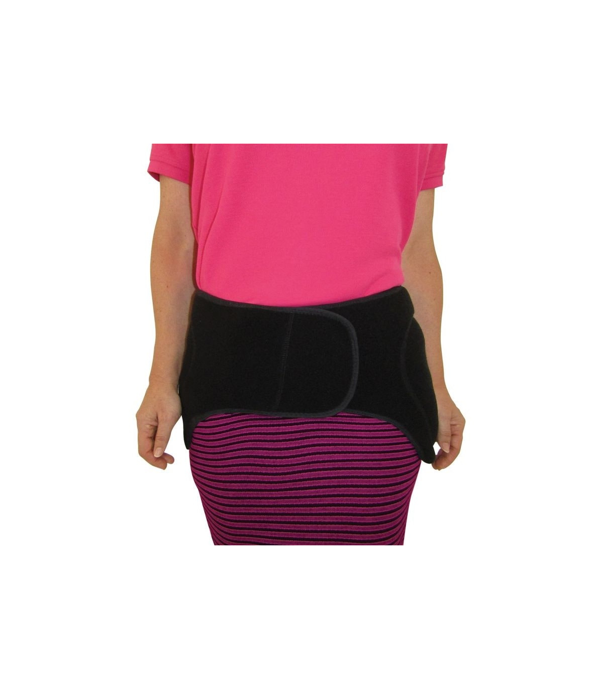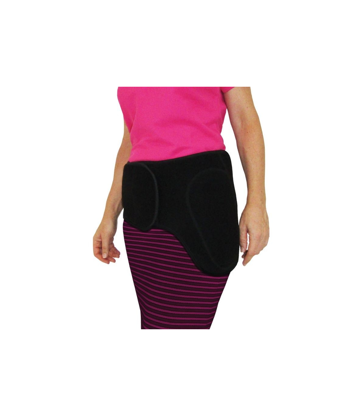 La ceinture de protection se met facilement grâce à sa large bande auto-agrippante et se porte par-dessus les vêtements au niveau des hanches.