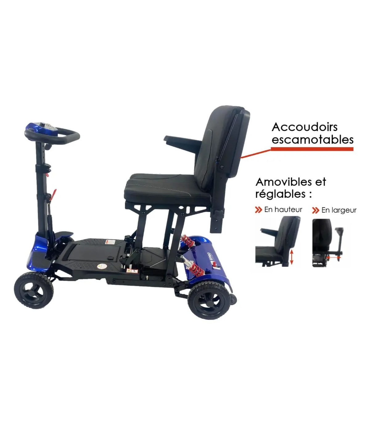 Pour faciliter les transferts, les accoudoirs du scooter électrique pliable sont escamotables et amovibles. Il est également possible de régler la hauteur et la largeur des accoudoirs pour une parfaite adaptation à l'utilisateur.