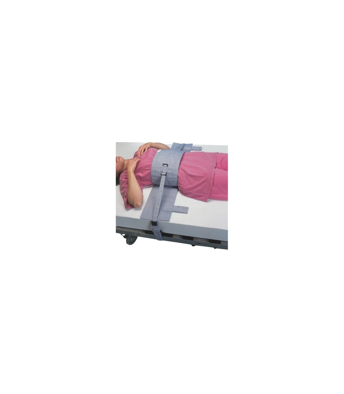 - Le positionnement dorsal permet une immobilisation totalement du patient grâce aux bandes latérales amovibles. Les bandes se fixent par l'arrière afin d'éviter que le patient se détache.