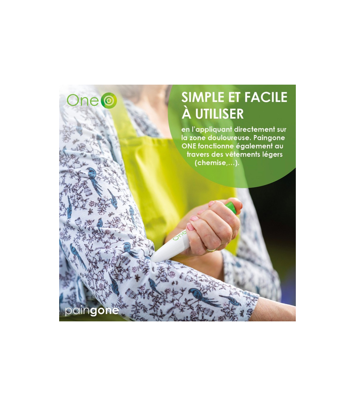 Il suffit de placer le stylo Paingone sur la zone douloureuse (même à travers un vêtement léger), puis d’appuyer 30 à 40 fois sur le bouton vert. L’ensemble du traitement prend environ une minute.