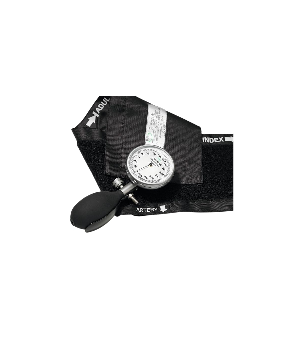 Le cœur de ce produit repose sur un manomètre F. Bosch Praktikus à aiguille, fiable et reconnu pour sa durabilité. Il est accompagné de 5 brassards velcro avec poche noire :