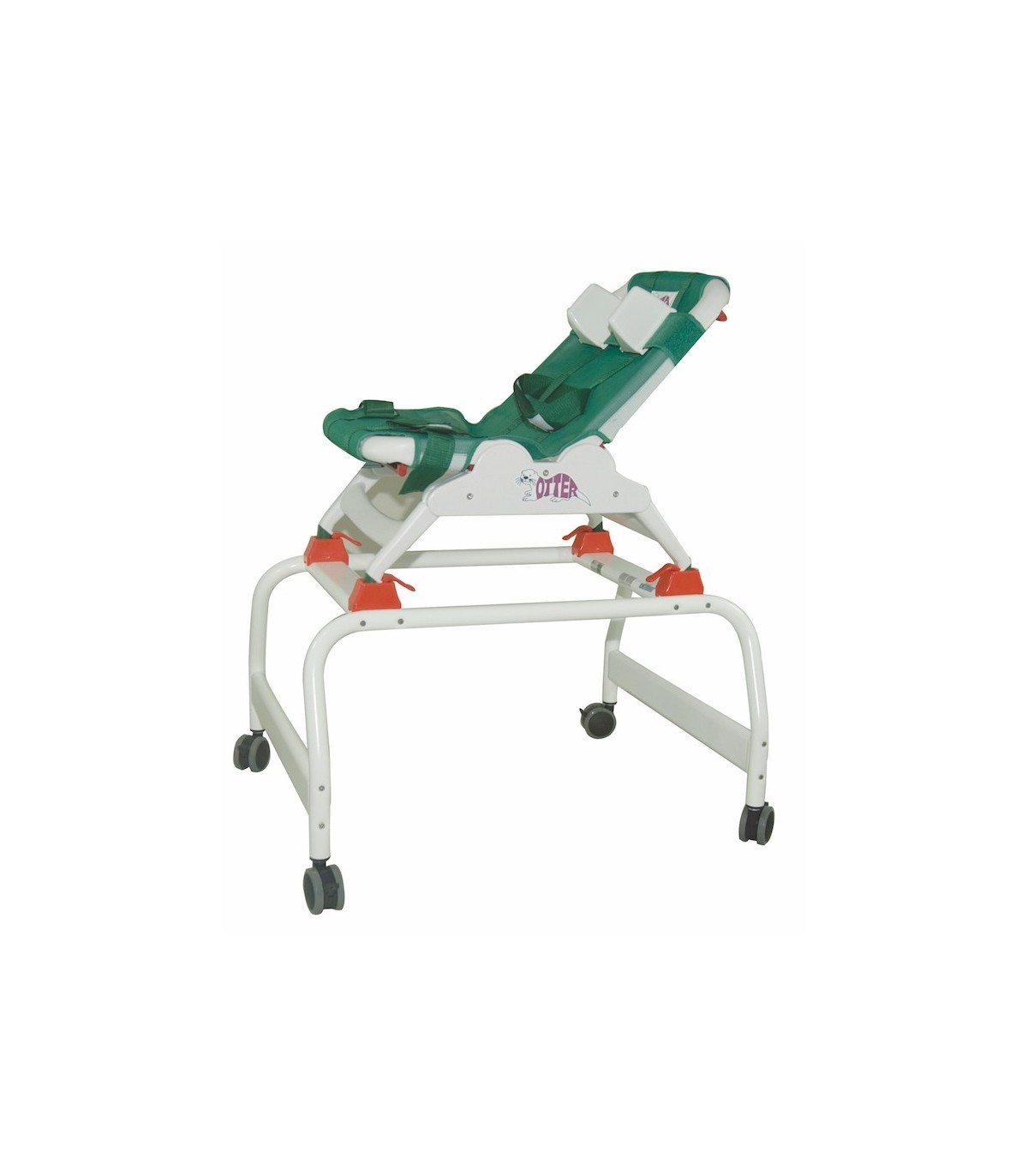Le surélévateur équipé de roulettes s'adapte parfaitement au transat enfant Otter et permet une utilisation dans une cabine de douche à fond plat.