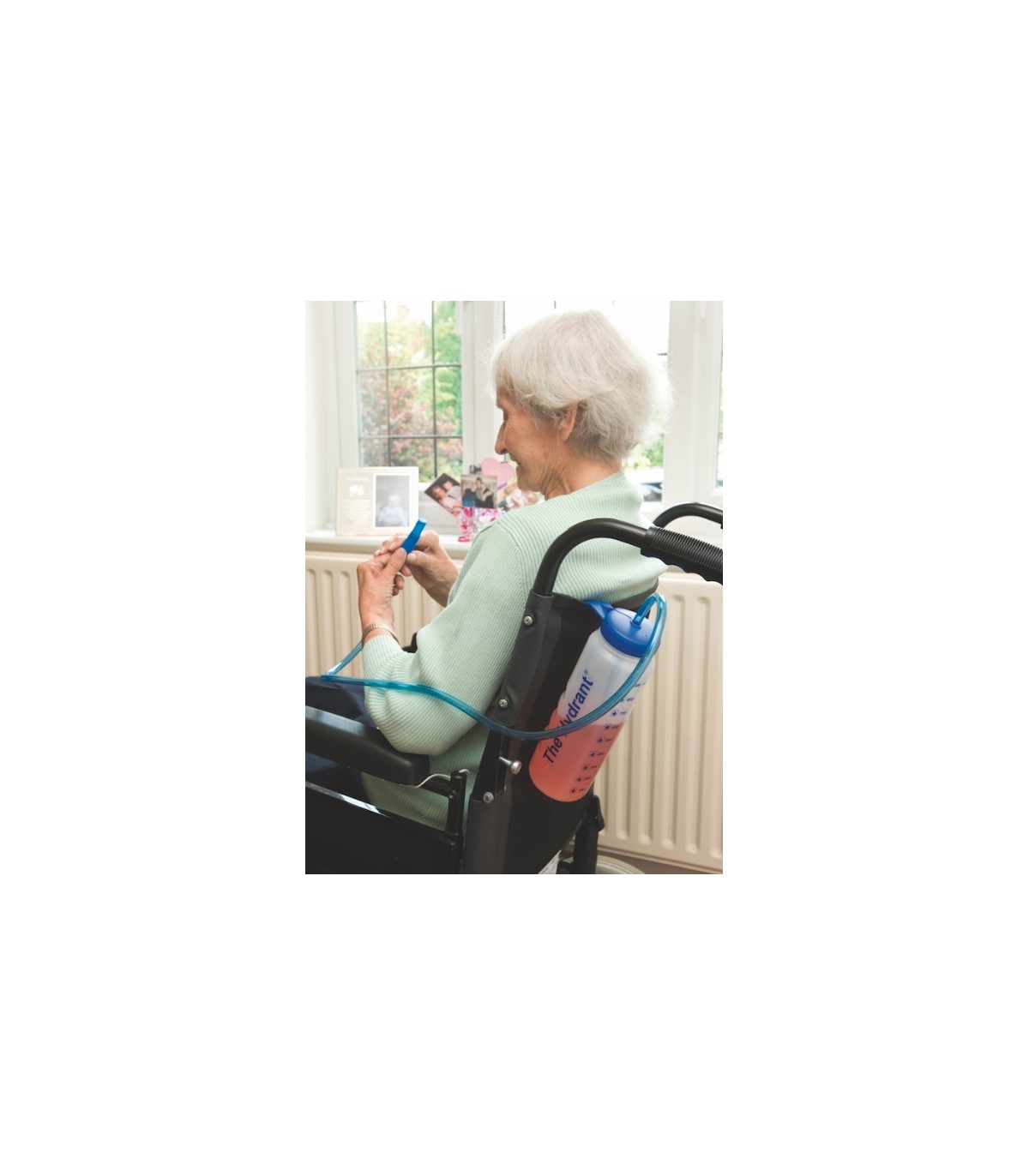 Ce verre ergonomique pour personne âgée d'1 litre est hermétique et peut se positionner sur le dossier d'un fauteuil roulant.