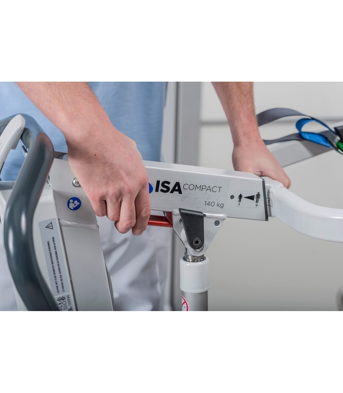 Pour plus de convivialité pour l'aidant, le lève-personnes Isa comporte une base incurvée aux dimensions réduites afin de permettre une meilleure maniabilité au produit.